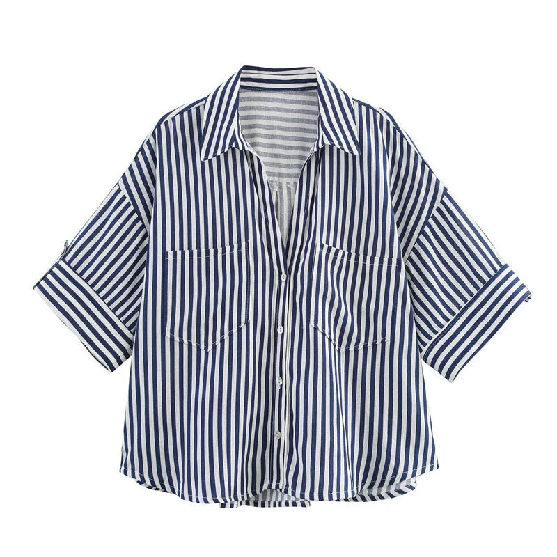 CM.YAYA 2025 Fall Autumn Women Half Sleeve Single Breasted Blouse and Shirt V-neck Pockets Street Casual Loose OL Tops Shirts